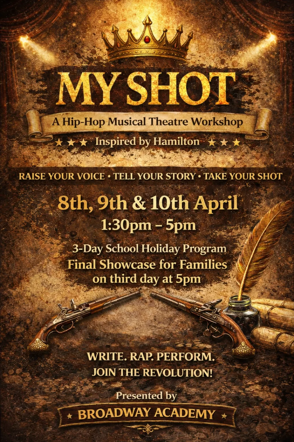 My Shot is an exciting 3-day musical theatre workshop designed for performers ready to challenge themselves through the powerful music, storytelling and choreography inspired by Hamilton the Musical.